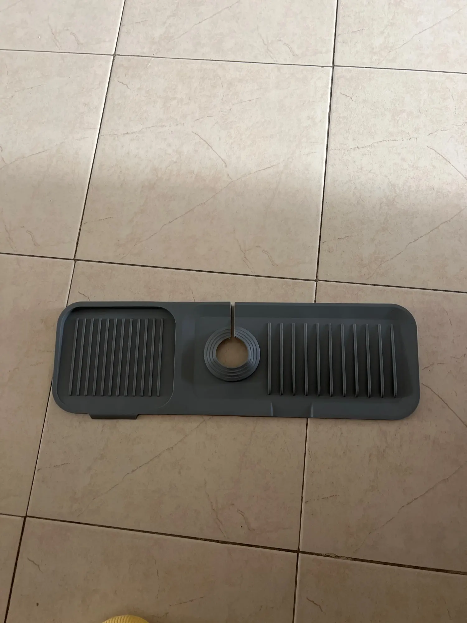 Engineered with a sloped surface and dual drain outlets, this mat directs water straight back into the sink.